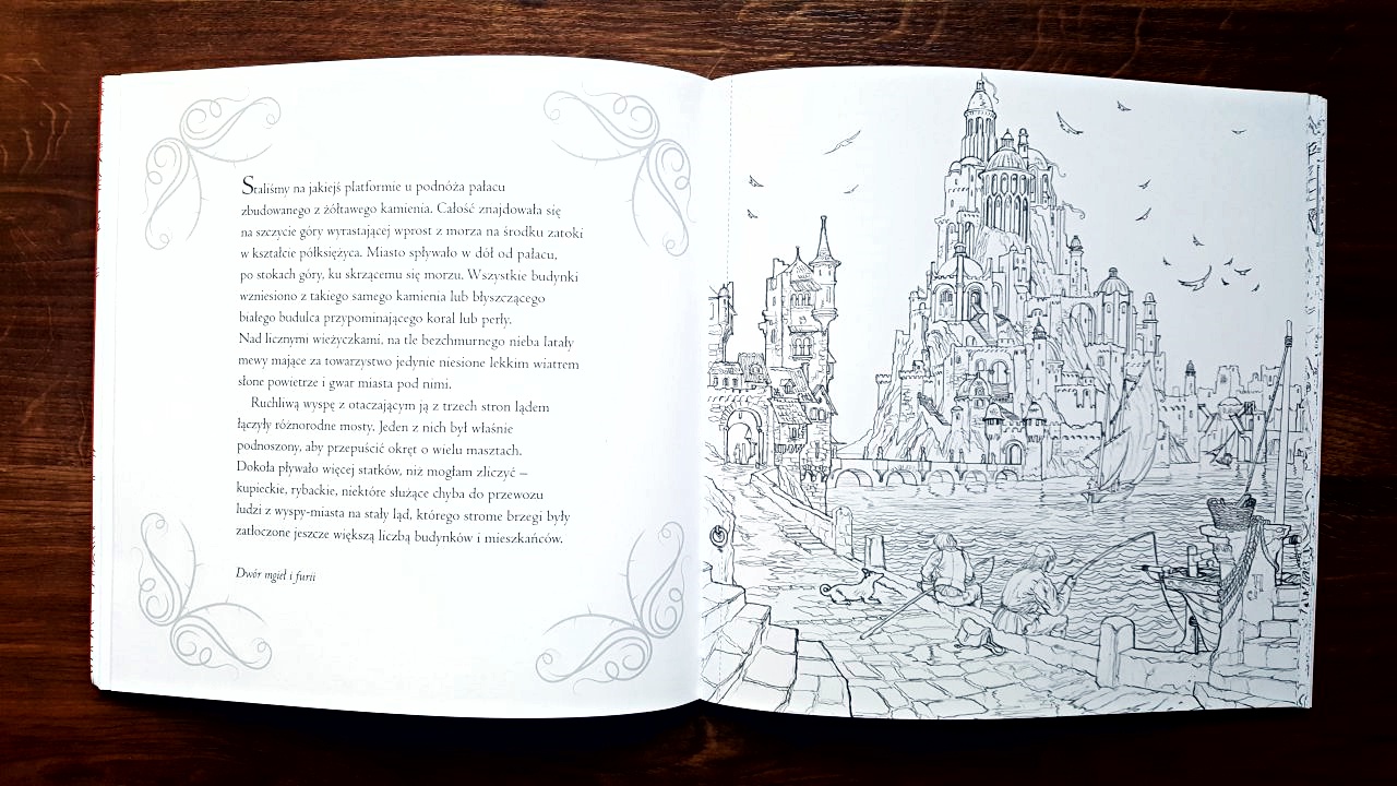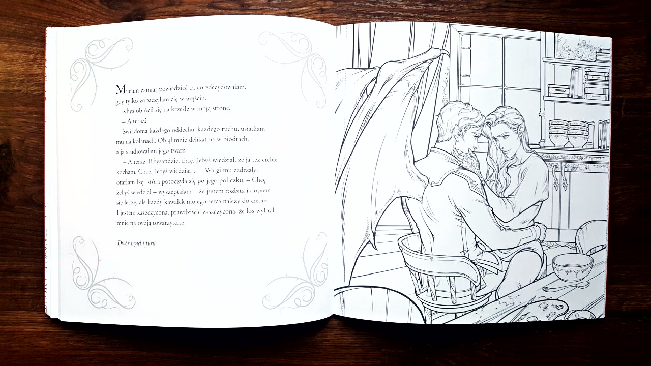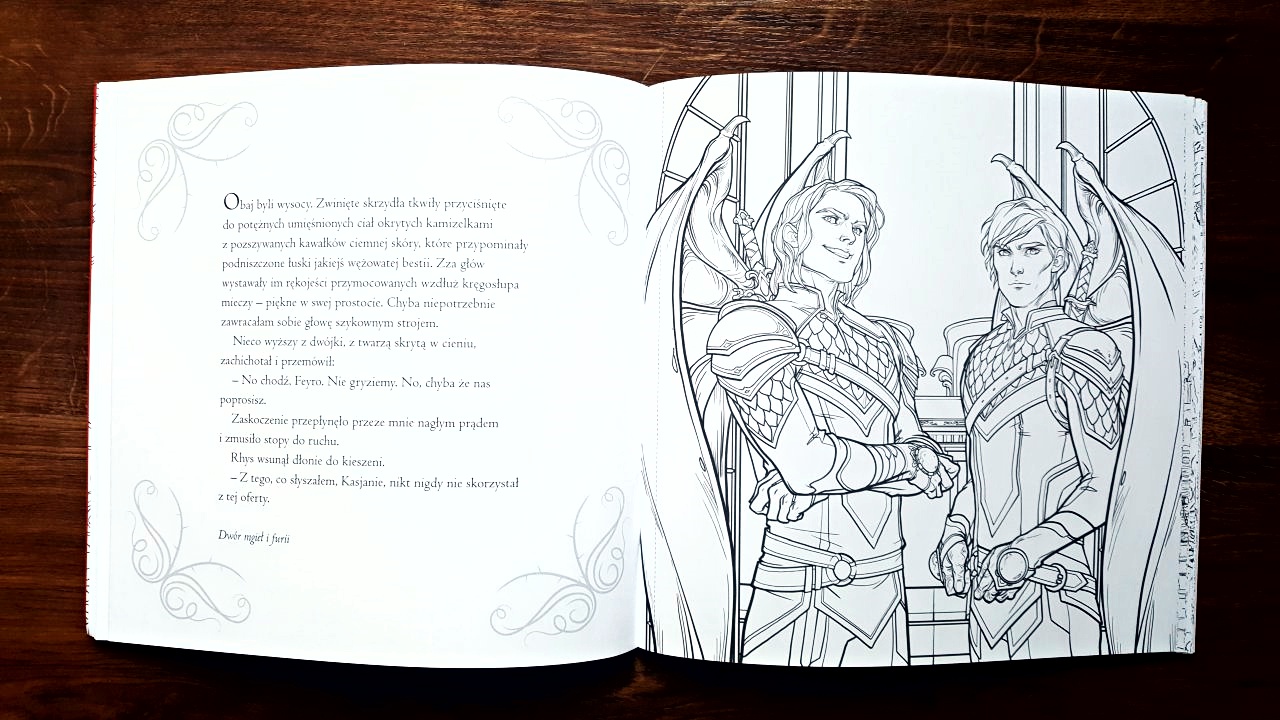 Wszyscy fani przygód Feyry i Rhysanda mogą jednak w oczekiwaniu na to wydarzenie raz jeszcze zanurzyć się w magiczny świat Prythianu kolorując przepiękne ilustracje autorstwa całego zespołu – artystki Charlie Bowater i ilustratorów: Adriana Dadicha, Yvonne Gilbert, Johna Howe’a i Craiga Philipsa.