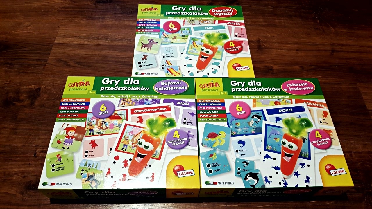Jeśli Wasze dzieci uwielbiają zagadki oraz interaktywne gadżety, to polecam Wam zapoznać się z ofertą gier dla przedszkolaków od Lisciani Carotina. Przeznaczone są dla grupy wiekowej 3-6 lat, ale zdecydowanie spodobają się również młodszym dzieciom.