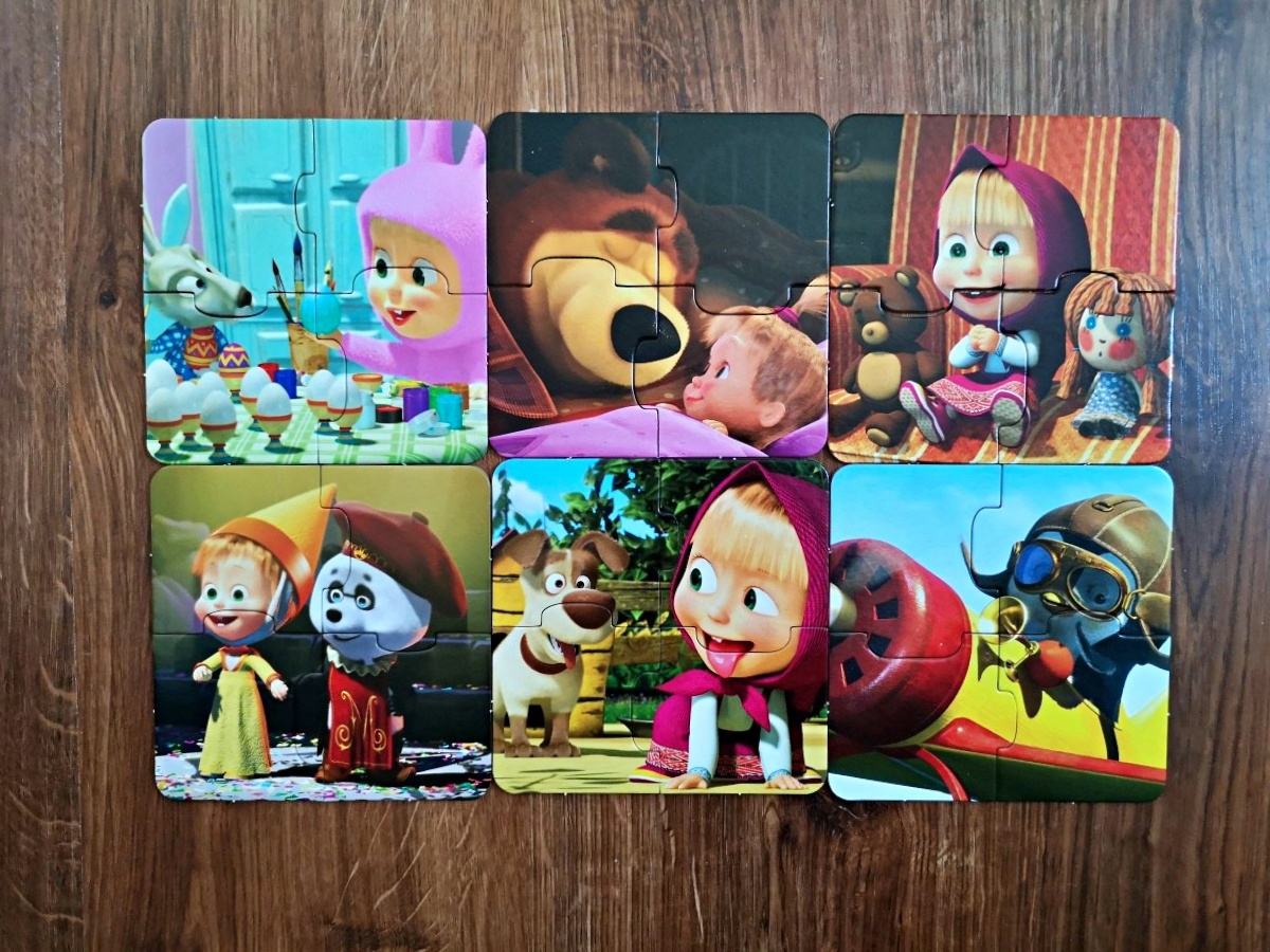 W opakowaniu znajduje się aż 6 różnych układanek, a każda związana jest bezpośrednio z konkretnym odcinkiem bajki „Masza i Niedźwiedź”.