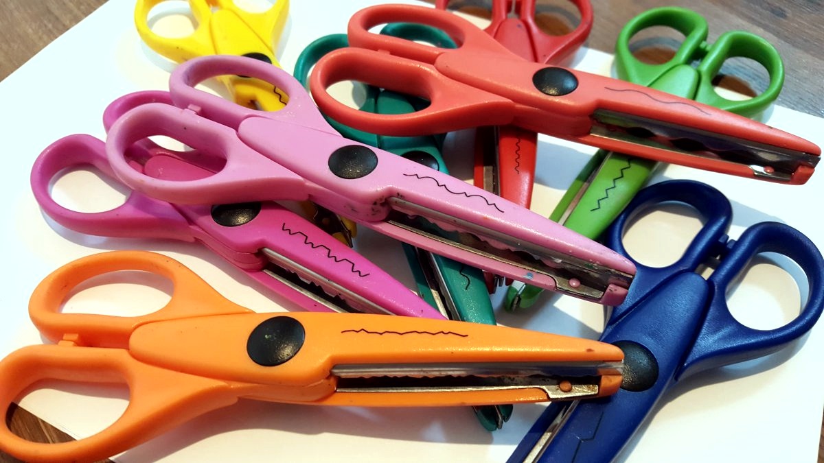 Wycinanie zwykłymi nożyczkami oraz ozdobnymi. Po śladzie – na początku po linii prostej, pozniej możemy dziecku zdanie utrudnić i narysować mu linię łamaną lub fale. Swobodne wycinanie według własnych pomysłów dzieci jest również bardzo ważne i doskonali wiele różnych umiejętności.