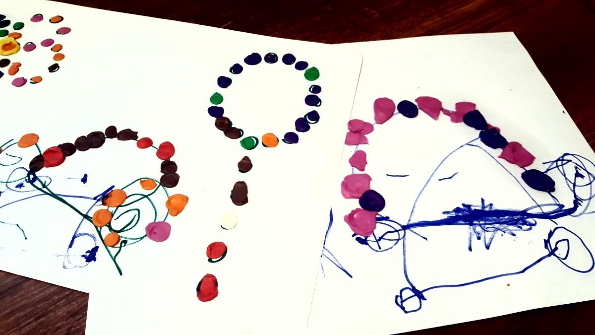 Wyklejanie plasteliną, kawałkami papieru kolorowego czy bibuły lub krepy (bibuła marszczona). Wystraczy zostawić dziecko z kartką i klejem i zobaczycie, że powstanie coś pięknego! Możecie też narysować kropki i prosić dziecko i przyklejanie np. plasteliny we wskazanym miejscu.