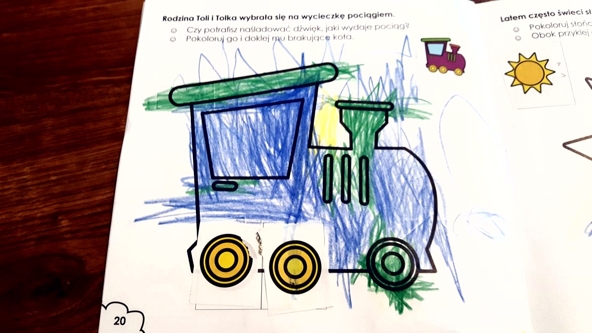 Posługiwanie się klejem w różnej formie – w sztyfcie, w tubce i w butelce. Przyklejanie swobodne według pomysłu i inwencji dziecka, ale również według wzoru, np. przyklej koła do samochodu. Świetnym ćwiczeniem są przeróżne naklejki – samodzielne przyklejanie ich w przedszkolnych i szkolnych podręcznikach może sprawiać trudność.
